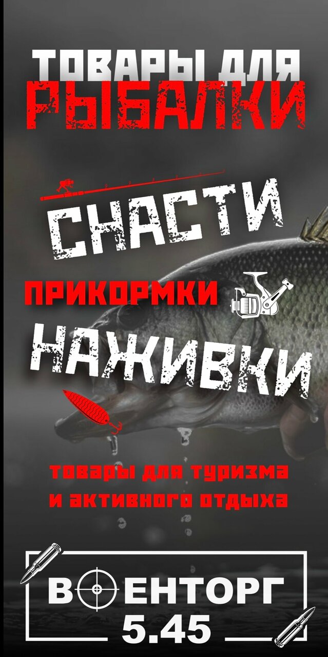 А также товары для рыбалки: снасти, прикормки, живые насадки, готовые монтажи и многое другое.